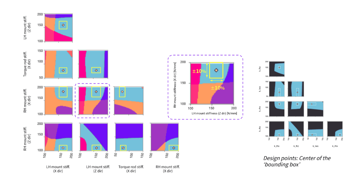 This knowledge enabled the team to visualize the feasible design space based on the new guideline. For example, to satisfy the natural frequency ratio <0.70, the RH/LH mount stiffness in the X-direction must be within the specified yellow area.