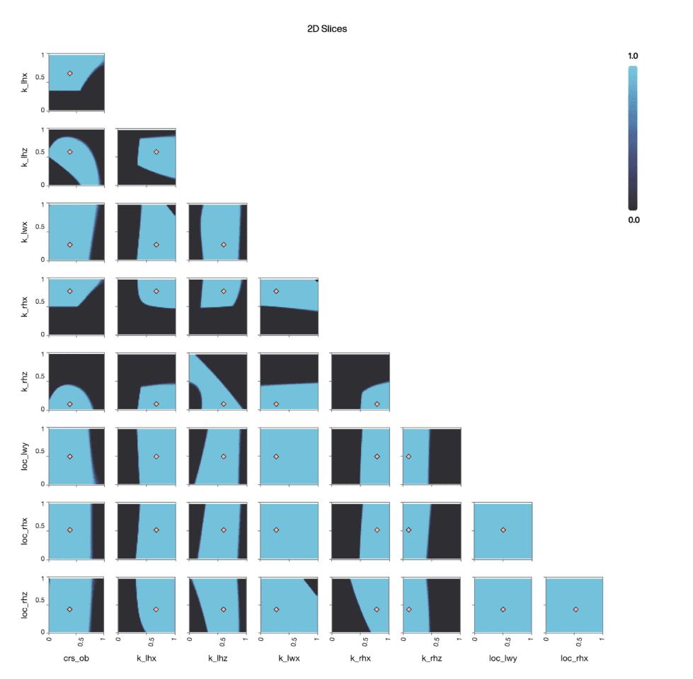 Designing for real-world variation: The interactive user interface visualizes a 'bounding box' around the nominal design across a critical subset of high-impact input parameters. This ensures that even with the inevitable 10% variation in mount stiffness during mass production, the design remains safely within the feasible region. Each colored region in these 2D slices corresponds to a different performance requirement, allowing engineers to instantly see how manufacturing tolerances impact the interplay between multiple stringent targets.