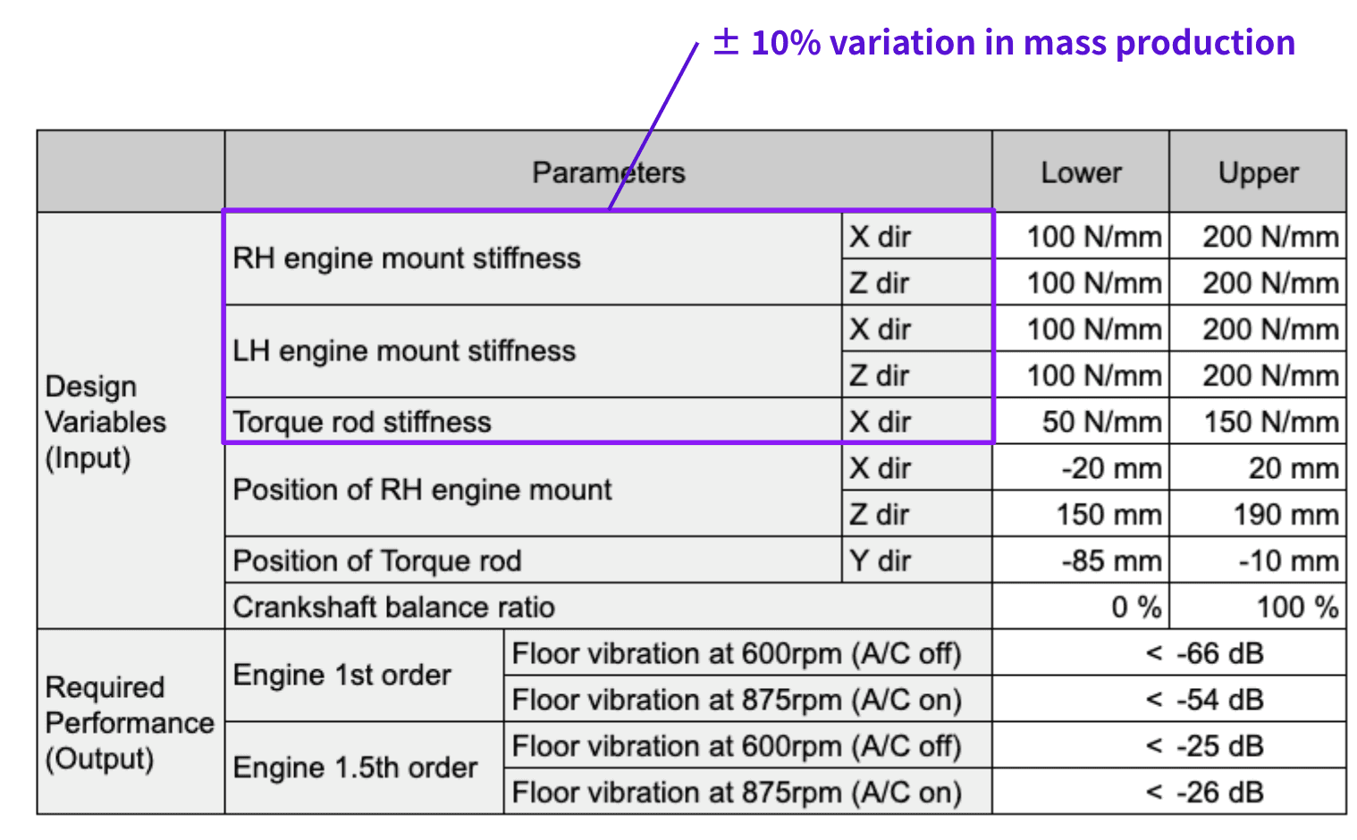 The design variables we optimized included nine distinct parameters: multiple engine mount stiffnesses in the X and Z directions, torque rod stiffness, and various mounting positions, alongside the crankshaft balance ratio. The requirements for performance (output) were focused on keeping floor vibration below specific decibel targets for the engine's 1st order (inertia force/pitch and yaw moment) and 1.5th order (combustion force/rolling moment) at both 600 rpm (A/C off) and 875 rpm (A/C on).