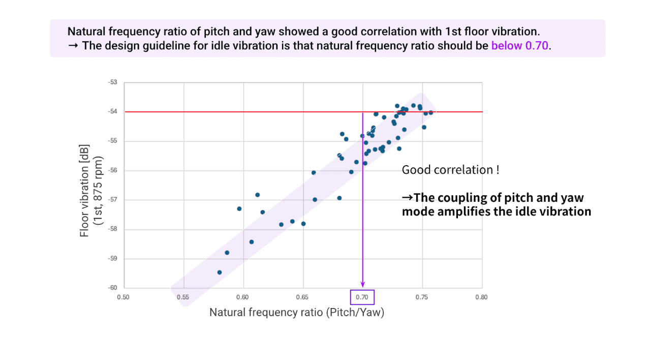 The breakthrough: Plotting the pitch/yaw natural frequency ratio vs. idle vibration reveals a clear, predictive design guideline