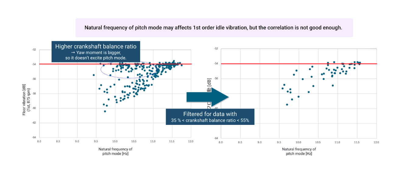 The visual exploration revealed a critical, previously unknown dynamic: the coupling of the Pitch and Yaw modes amplifies idle vibration. While the correlation between the natural frequency of the pitch mode and the 1st order idle vibration was initially not high enough, filtering the data to a narrow range of crankshaft balance ratios (35% < crankshaft balance ratio < 55%) showed that the Yaw mode acts as a hidden amplifier of floor vibration.
